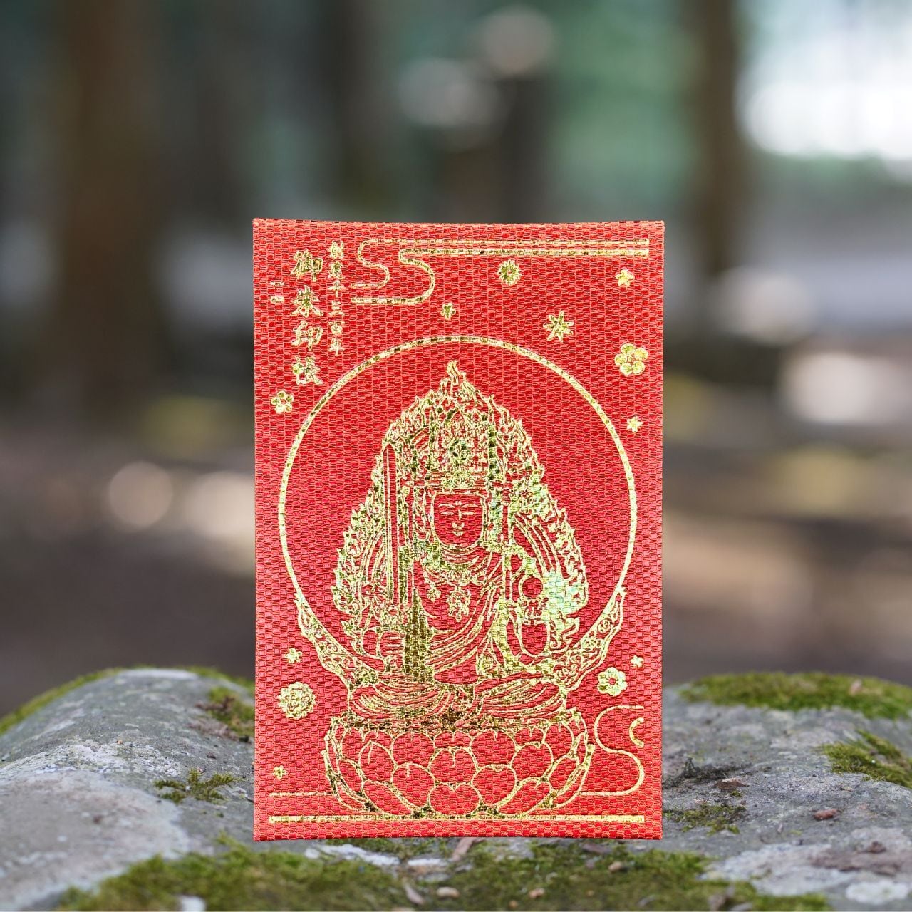 表面には守護を感じさせる仏様の御姿、裏面には鳥居や縁起文様が配され、